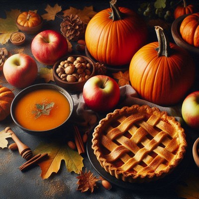 A fall table setting with pumpkins, apples, pie, and soup