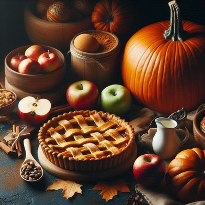 A delicious apple pie with a pumpkin and apples