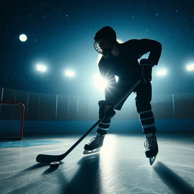 Silhouette of hockey player on ice rink at night