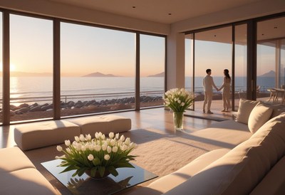 Romantic sunset view from a modern coastal home