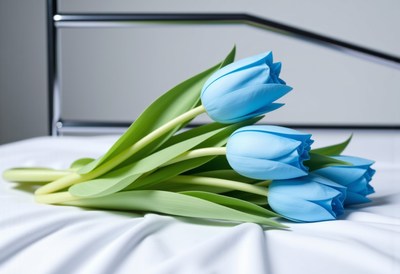 Blue tulips arranged on a bed with soft bedding