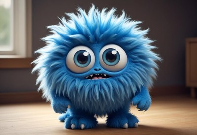 Cute blue furry creature with big eyes in a cozy room