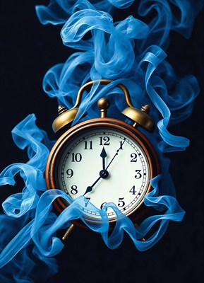 An antique alarm clock is surrounded by blue smoke